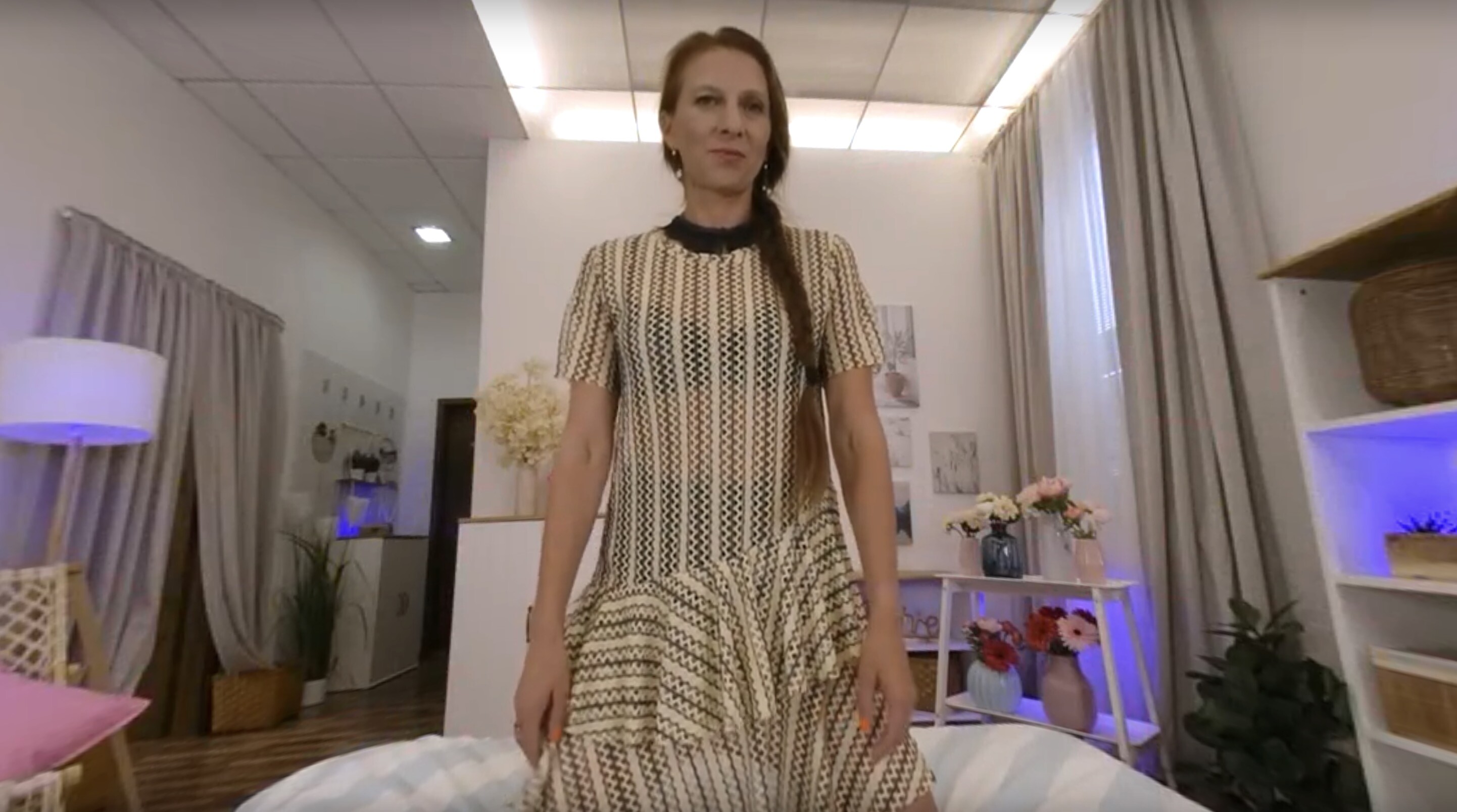 Things heat up when she shifts into a sultry sitting pose, locking eyes with the camera like she’s daring you to look away. The tension builds, ya know, as she plays with every subtle movement, making the air thick with anticipation. It’s not just a performance; it’s a damn journey. Then, when she transitions to a standing tease, it’s like the room catches fire—pure, raw energy that hits you hard.