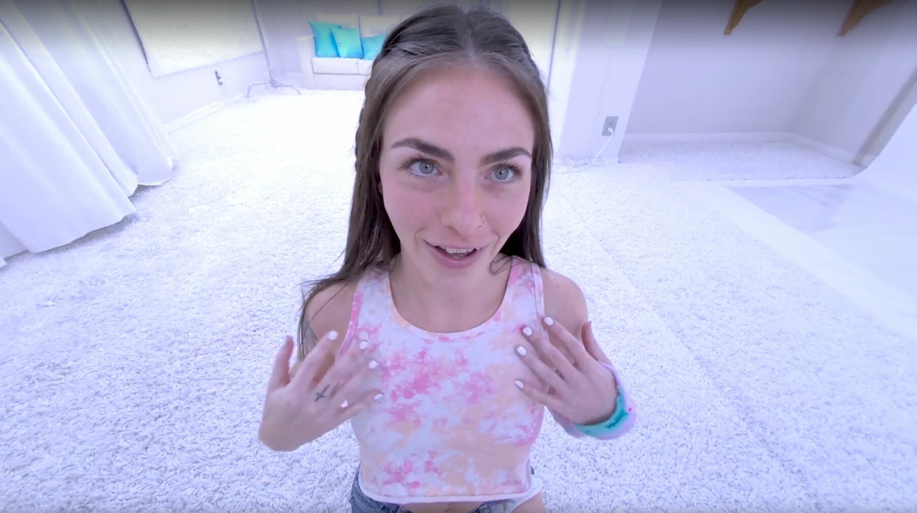 Man, I gotta tell ya, watching Tiny Rhea in this 4K VR striptease is somethin’ else. Right from the start, she’s got this playful, teasing vibe in that crisp white studio, locking eyes with you through the camera like she knows exactly what she’s doing. I must say, her slow, deliberate moves as she peels off each layer are just mesmerizing—pure art, if you ask me.