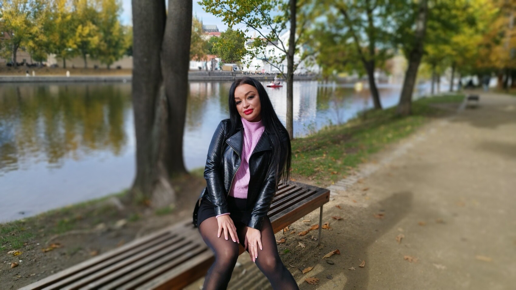 Man, checking out this 6K VR behind the scenes with Daphne Klyde is like peeking into the making of a wild fantasy. From the outset, Daphne Klyde's got this brunette fire, sitting on a bench by the water with two guys, her in a pink sweater and black skirt, them casual—one muscular in a tank, the other smiling in denim—setting a cheeky cheating wife vibe under autumn trees.