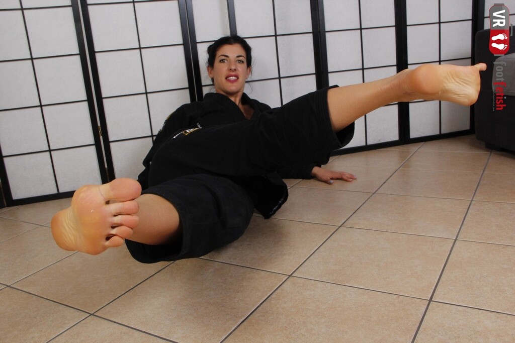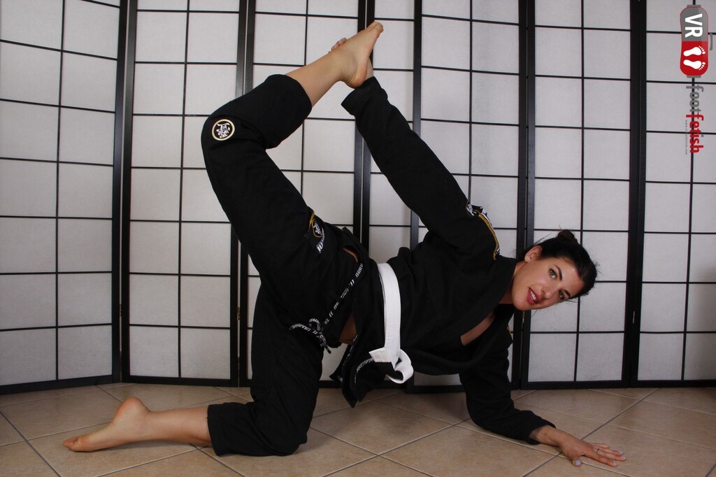We usually focus our attention to feet as one of the most gorgeous parts of a female body. However, we totally forget about the fact that feet can be deadly weapons when wielded by the most experienced karate masters. Bianca Blance is one such karate enthusiast and this is probably something you didn’t know about her. She is wearing her black kimono and her hair tied in a bun. Her feet are naked, just like every time she does karate, and she is here to demonstate her deadly force to us. She shows us her amazing feet and what they can do. Her wrinkled soles have hit numerous targets and they have become super deadly with her training. Listen to what she has to say and watch as her feet dance a deadly dance that will make you scared and horny at the same time.